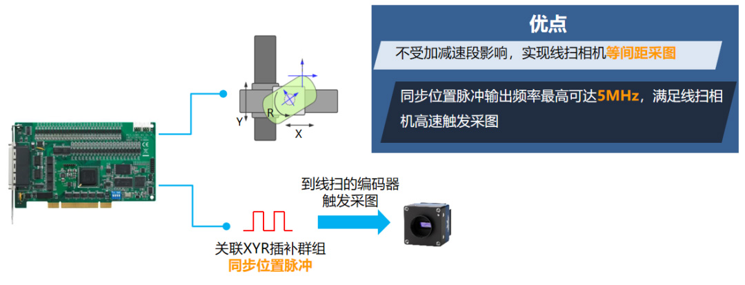 研華針對這一應(yīng)用難題,提供了專用于該場景的運(yùn)動控制卡PCI-1285T,運(yùn)用多軸旋轉(zhuǎn)刀尖跟隨算法,高速連續(xù)的將外觀輪廓軌跡的每個點(diǎn)精準(zhǔn)通過視覺檢測位置,同時發(fā)出同步位置脈沖配合線掃相機(jī)進(jìn)行連續(xù)采圖。