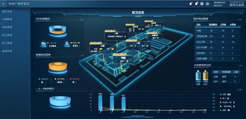職衛管理致力于員工的健康管理與勞動保護,為員工創造一個安全、健康的生產環境。其核心內容涵蓋了一人一檔管理、特殊崗位體檢以及勞保用品的發放與穿戴防護等方面。研華EHS廠務環安衛管理系統還對化學和物理等職業危害因素進行深入識別與有效管理,以及AI監測員工的防護品穿戴。