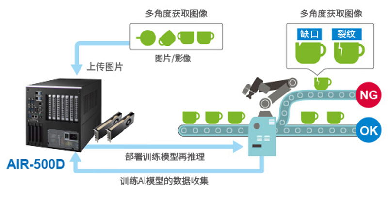 傳統(tǒng)的機器視覺系統(tǒng)有時無法區(qū)分缺陷,因為視覺上相似的部件之間也可能存在差異和偏差。通過利用AI技術,可以解決這個問題,并提高整體檢測的精準度。本案例中的客戶是一家機器人視覺設備制造商,他們將自己的機械臂與AI技術相結合,進行檢測缺陷。AIR-500D利用2 x RTX GPU處理不同生產(chǎn)線上捕獲到的大量圖像數(shù)據(jù),然后,對這些圖片進行分類、檢測和重新整理,訓練AI模型,提高分析結論的準確性。