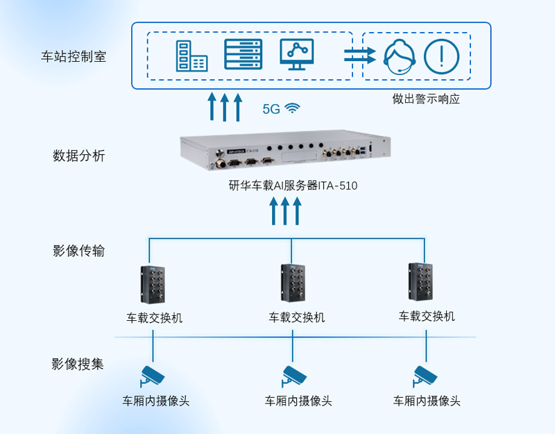 國內某線路地鐵采用研華ITA-510作為其智能化列車的前端分析預處理單元。通過安裝在車廂內的感知攝像頭,實時采集高清圖像視頻數據,通過ITA-510強大的AI算力,進行前端圖像視頻的預解碼分析處理,利用計算機視覺技術和圖像處理算法來識別車廂內的實時擁擠狀況。再將結果數據傳輸到車載服務器進行分布、處理,最后通過車地的超高速通訊將處理數據上傳至云平臺,來實現車站客戶端的應急聯動和乘客流量引導等精細化調度作用。運營方可以通過乘客信息系統或者APP對外發布,引導乘客有序乘車。同時,該系統也可以對車上的異常行為做監測,比如乘客沖突,安全事故等,可第一時間報警或者通知工作人員。智能化的攝像頭充當了列車內的安全員,可以有效減輕地鐵運營方的員工作業強度,降低運營成本,提升運行效率。