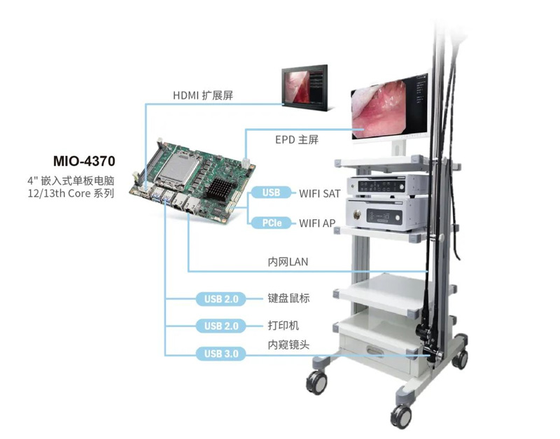 經(jīng)過反復(fù)的選型比對,研華提供了首款4英寸EPIC小型嵌入式單板電腦MIO-4370,尺寸165x115mm,相較于Mini?ITX節(jié)省35%體積。搭載嵌入式最新的Intel 12/13代CPU 平臺,提供超高的計算性能。同時,提供了雙HDMI+EDP的獨立3顯示,其中針對內(nèi)窺應(yīng)用,主屏幕EDP可以達到4K分辨率。